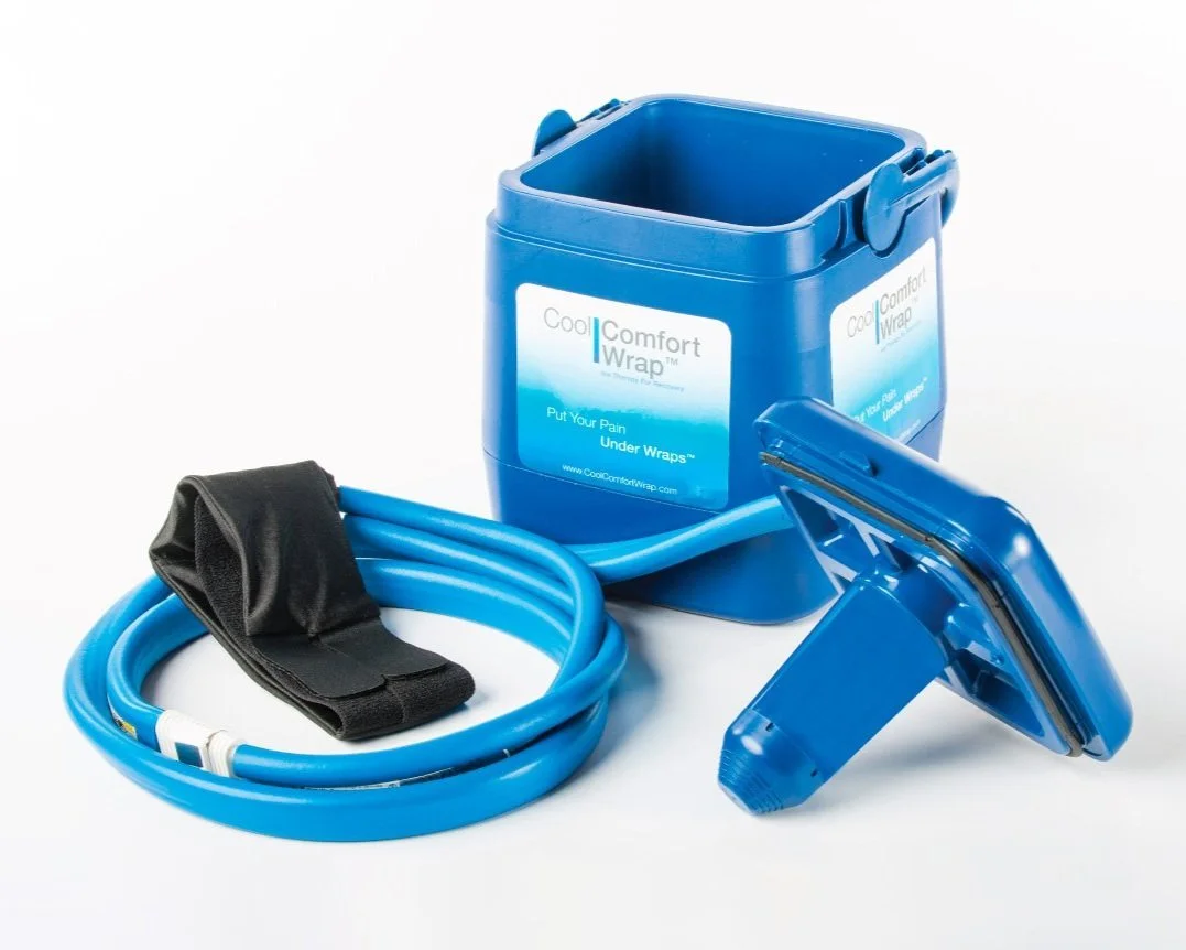 The Cool Comfort Wrap™ System provides cold therapy through temperature regulation. By utilizing ice and water that is circulated from an insulated fluid reservoir to a pad that is applied to your postoperative site, the system provides cold therapy for an extended period of time between ice changes.